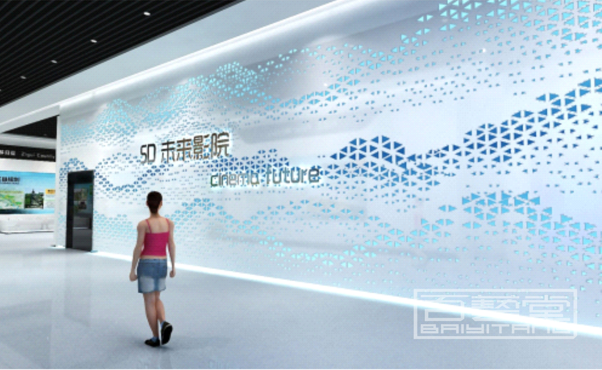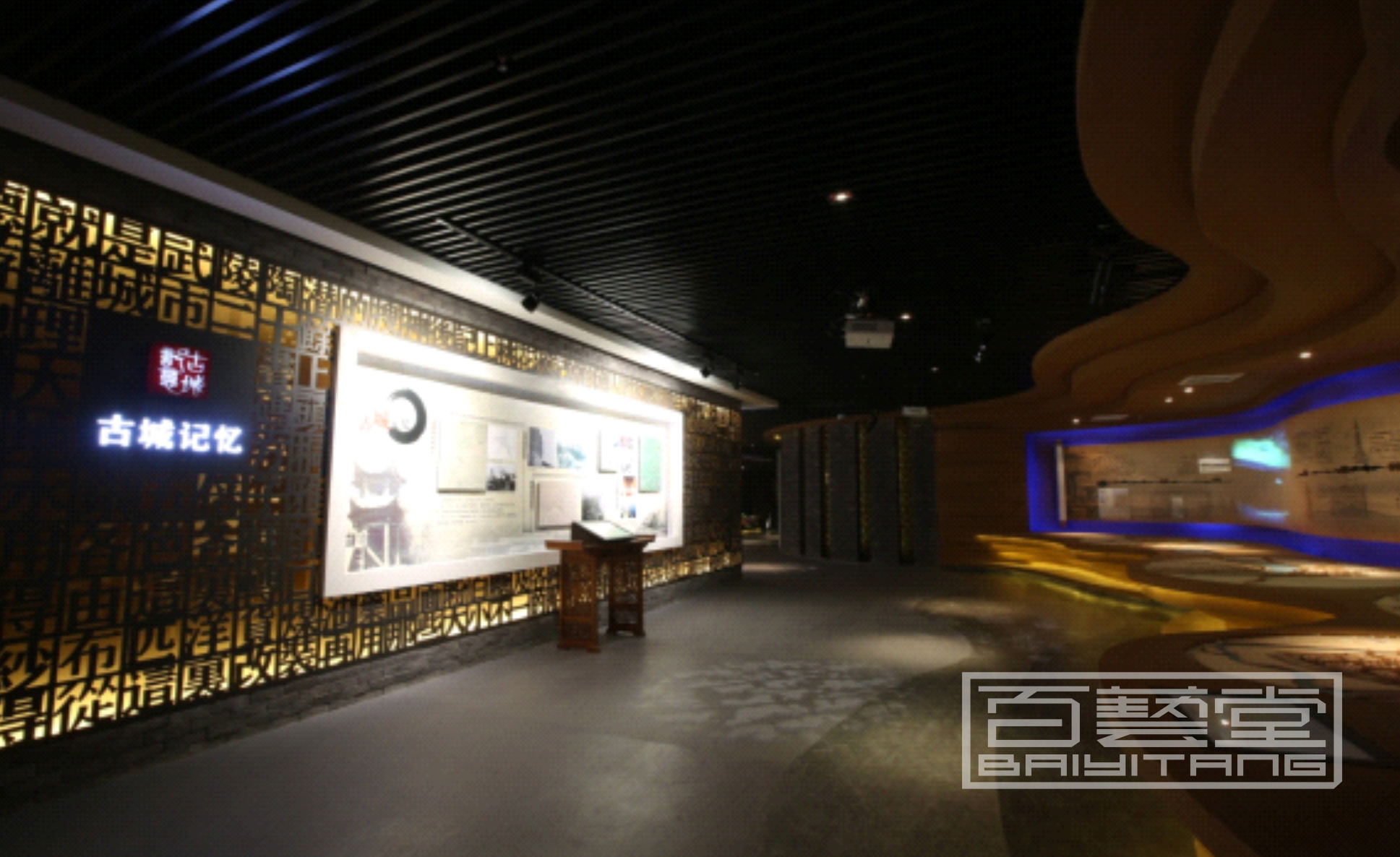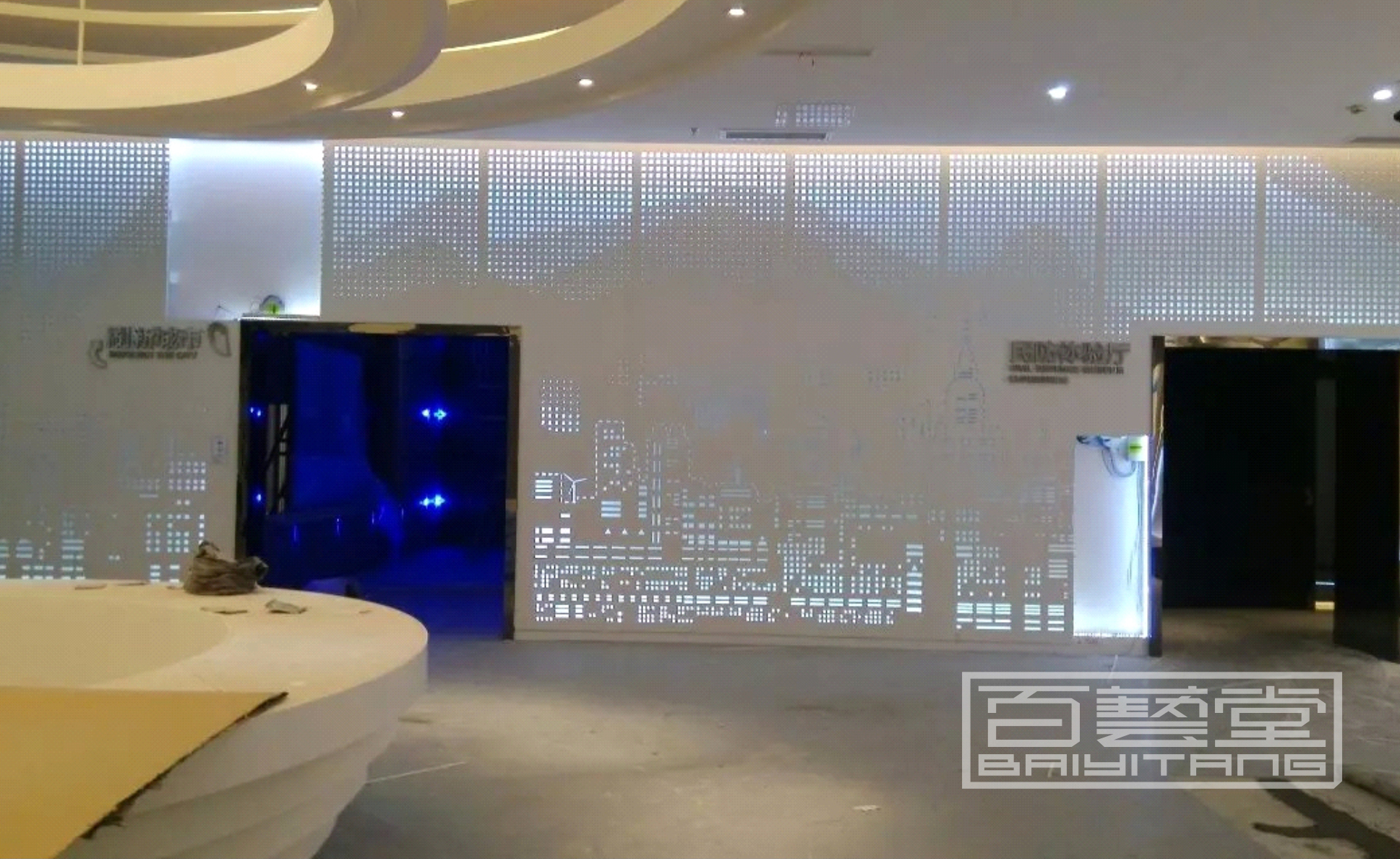 蝕刻彩色不銹鋼、波浪形鋁單板,鋁雕刻板,點(diǎn)綴效果,鏤空內(nèi)側(cè)藏?zé)魩В瑲v史區(qū)鐵灰色藏暖光,現(xiàn)代區(qū)白色藏白光或藍(lán)光,也可用來(lái)包裝影院數(shù)字沙盤等外墻面,實(shí)體效果非常美觀,創(chuàng)作手法隨意發(fā)揮。